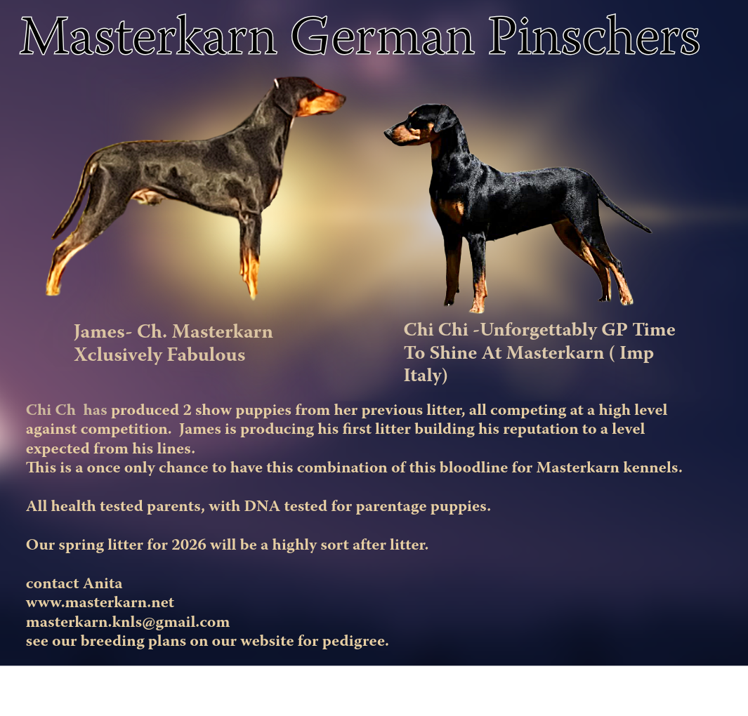 Follow us on FB. Masterkarn owners group. or Masterkarn German Pinschers YouTube - Masterkarn German Pinscher Kennel