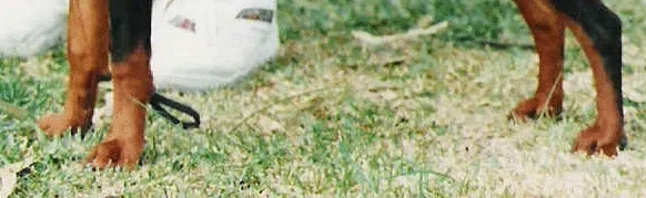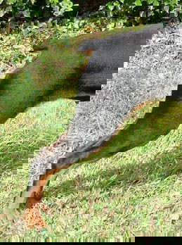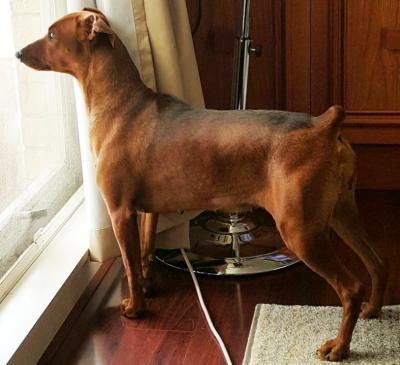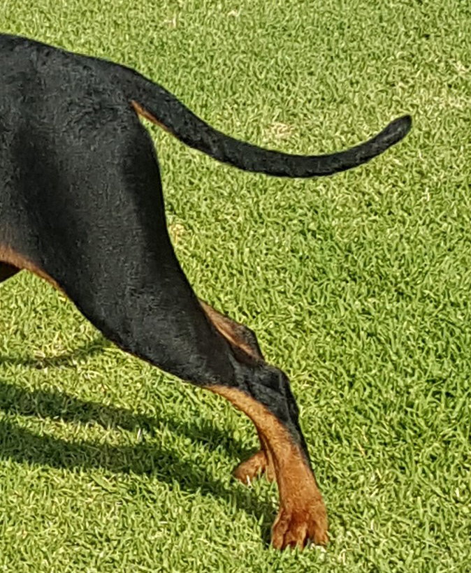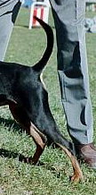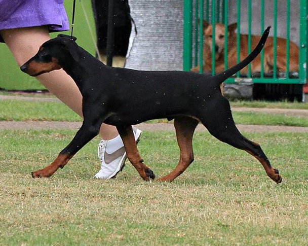 The German Pinscher gaits with its head in the almost level position if built correctly while on the move. See strong topline held on the move in the gait.