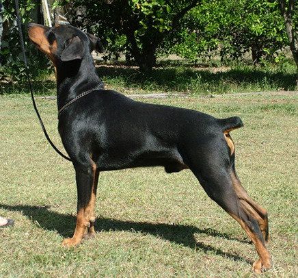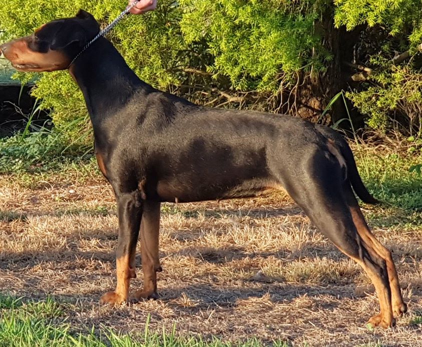 Ear sets should not be erect like the Miniature Pinscher, but this is an issue in some lines of GP's due to the introduction of the Min Pin when Werner Jung the original founder used oversized Min Pins to revitalise the German Pinscher breed in 1957, since it was almost extinct with only 2 females remaining in East Germany at that time. Very high set ears are common and acceptable providing they do not stand erect and lay correctly as in the bitch below.
