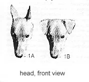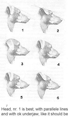 Head type is similar to the shaved Schnauzer. The head is an elongated BLUNT WEDGE shape, but not too long as in the Dobermann who has a long elongated head (modern). A slightly shorter muzzle is common and correct in this breed. Full deep muzzle and strong under jaw is required to perform this breeds applied work. It is expected that the fill under the eye lacking contributes to the snipey muzzle as often seen and a bit of too much cheekiness is common. It is commonly believed the muzzle should be well filled under the eye. Snipiness is commonly seen in the GP. NEVER should it be the same as the Dobermann head. It is a shorter head than the Dobermann and most similarly to the giant Schnauzer.