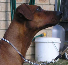 The neck of the German Pinscher is called to be elegant but strong. Elegant in this sense is not giraffe like or refined- so fine creating a weak thin neck. These dogs are hunters and must have enough strength to bite and shake a good sized prey or even larger animals it catches.