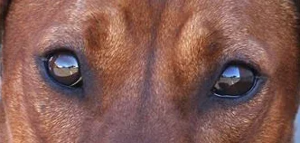 The eye colour in the Stag Red, Blue and Fawns are accepted if a lighter colour than the dark eye expected in the black in the standard and correspond to the pigments of the coat colours. The reds of all shades should have a dark pigment - never light or missing. The GP must have an oval eye, NEVER a round eye. The darker eye and pigment is sort after and is correct.