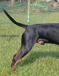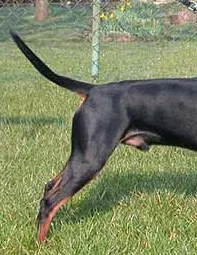 The tail is high set but never gay tail or hooked in the docked dog or the natural tailed dog.